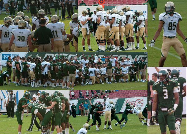 The team was divided into a green and white squad and assigned to each team through a draft. The key position for both sides was under center at quarterback as the Bulls look to find a replacement for former star BJ Daniels. The white squad was led by Redshirt sophomore QB Matt Floyd who saw action in 7 games last year, starting two and the green squad had local hero and former Tampa Jesuit quarterback, Redshirt Senior Bobby Eveld leading them, who saw game action last season as well. As its said on all levels of football, if you have two quarterbacks that probably means you don’t have one, and it looks like coach Taggart still has a lot to sort out at a very key position; Floyd struggled with taking the snap under center and Eveld, while the elder statesmen, did nothing to separate him from his competition.