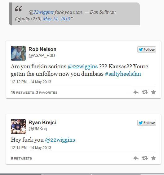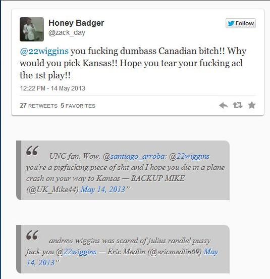 Its one thing to be fanatical about your team but it’s another to be downright disrespectful and these tweets are a perfect example of how society thinks it can say whatever it wants to whomever because it is protected by the internet. I seriously doubt these douchebags would verbalize this level of displeasure if given the opportunity to say this in the presence of Mr. Wiggins. But this is the gift and the curse of being a big time athlete; for every fan you have, there will be 10 haters who look forward to feasting on every misstep you will have and with the expansion of social media every Joe Schmo sports fan sitting in his parent’s basement will feel entitled to say whatever they feel. So the sooner he learns to ignore and disregard these types of comments the better, because these vicious words may pale in comparison to what he may hear in his first major road test versus the University of Florida December 10 in the SEC vs Big12 challenge or any opposing team’s gymnasium who wants to rattle him off of his game.