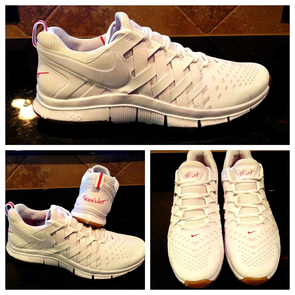 Houston Texans superstar J.J Watt announced yesterday via twitter that Nike will be releasing a signature shoe in his honor. The “Mega Watt” is a specialized mock-up of Nike’s popular Free Trainer 5.0 that is primarily white with slight hints of red being showcased on the tongue & heel writing and will feature what appears to be a gum bottom.