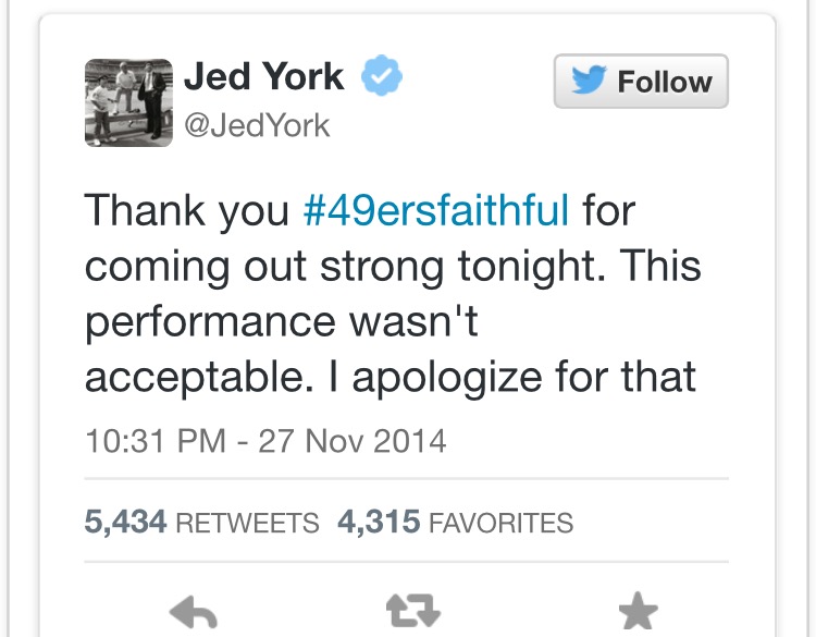 It was already known that he did not have the best of relationship with General Manager Trent Baalke and Team President Paraag Marathe, but when CEO Jed York sent this tweet after the 19-13 home loss to the Seattle Seahawks: