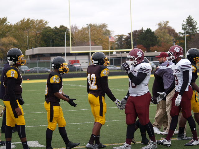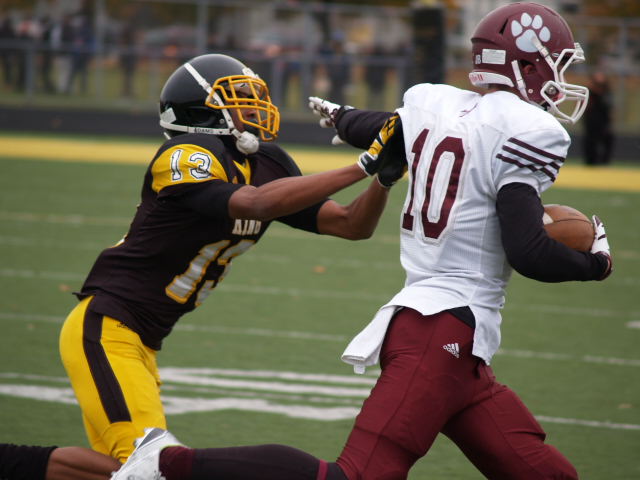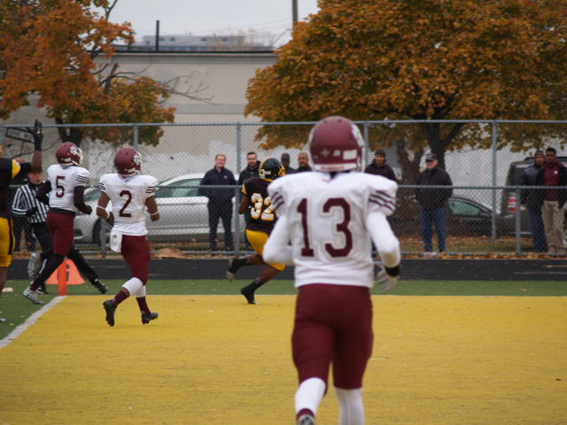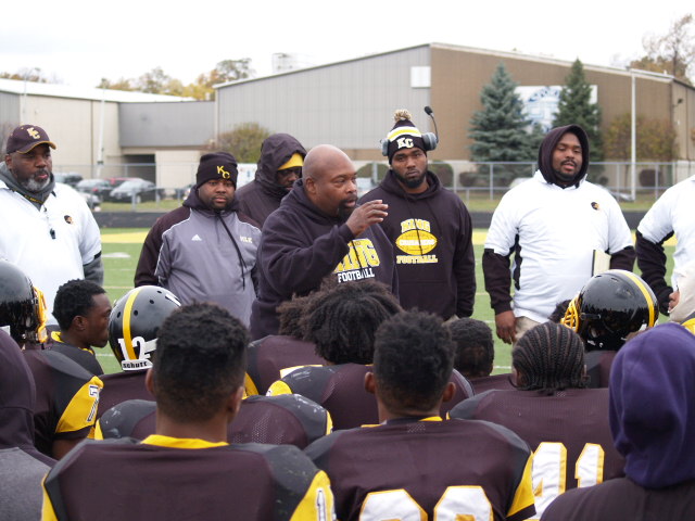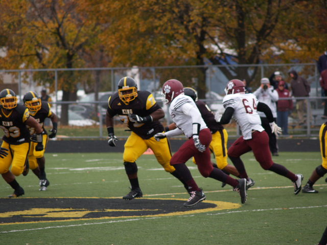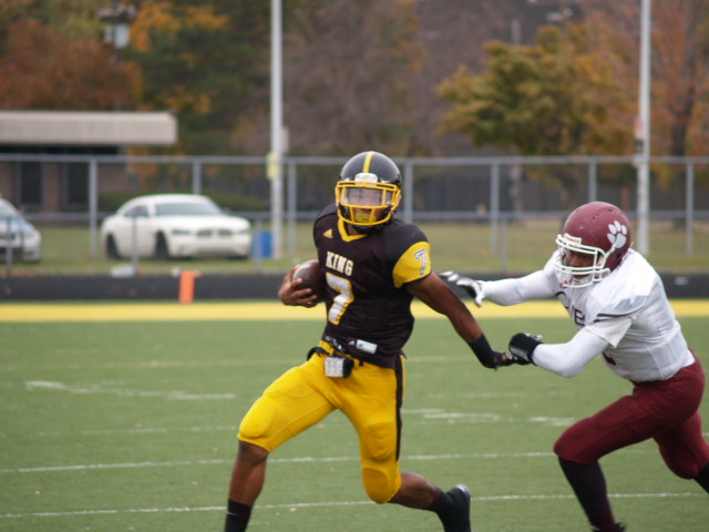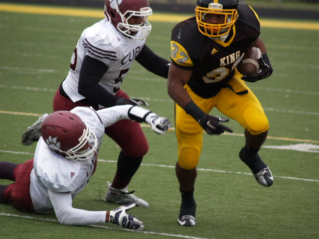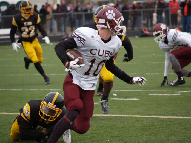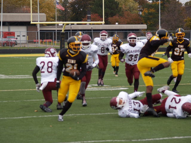 In a first round playoff matchup that could have been a city championship a few decades ago; it had that type of feel to it. The game got off to a fast start with U-D Jesuit capitalizing on a fumble on the opening kickoff and went up 7-0 before most Crusader fans could find their seats. It didn’t take King long to answer the call when Lavert Hill took the kickoff back to the house with an inspired run to tie the game at 7. King forced a fumble but gave it right back as Scott Nelson intercepted the ball and scored to put the Cubs ahead 14-7. The King offense drove back down the field and Martell Pettaway busted through the line and tied the game at 14. King’s kickoff was mishandled and recovered by the Crusaders making a total of four turnovers in the 1st quarter. Didn’t take long at all for King to capitalize as Armani Posey connected with Lawrence Bryant to go ahead by a touchdown, 21-14. The action finally slowed down until the Cubs added a 32 yard FG by David Anton to cut King’s lead to 21-17 which remained the score at the half.